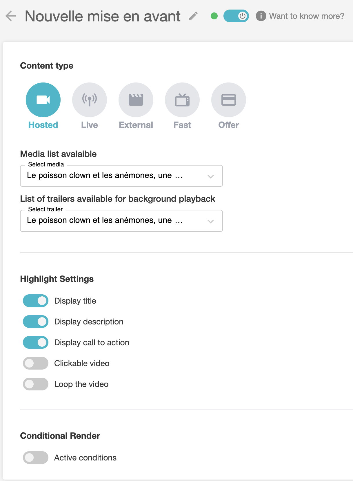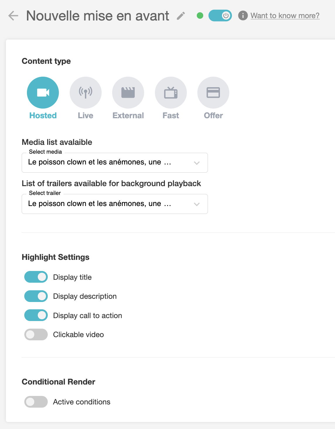 Would you like a video to appear automatically when your home page is opened? Highlighting is a component that allows you to display a trailer, live stream, external video or FAST TV channel at the top of your home page.