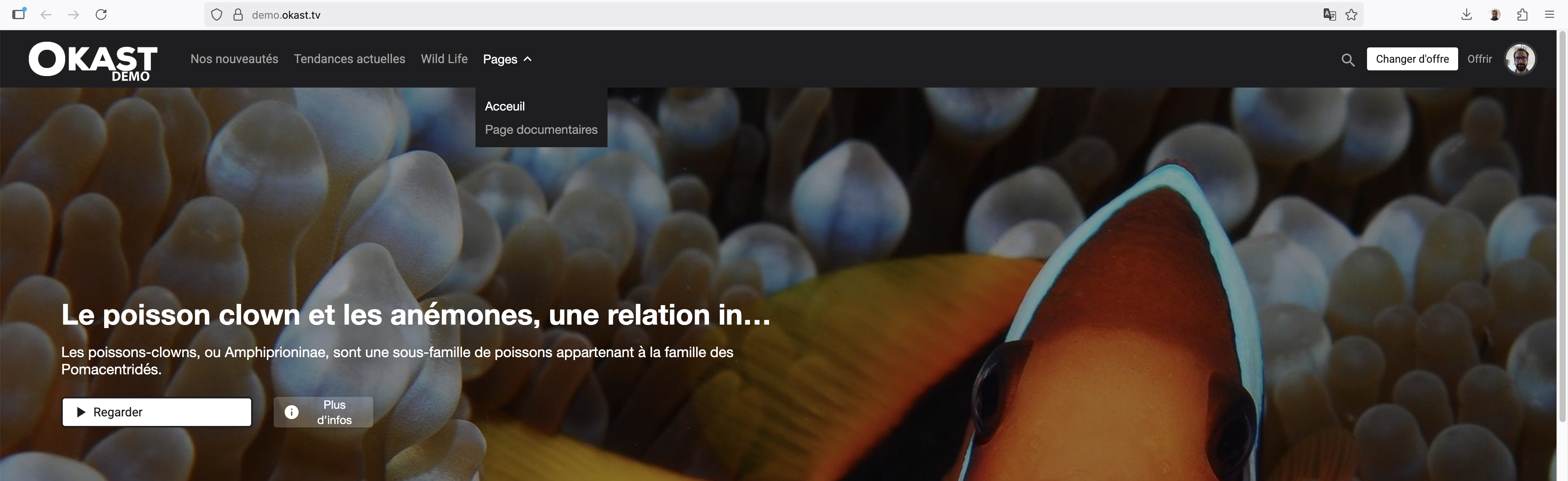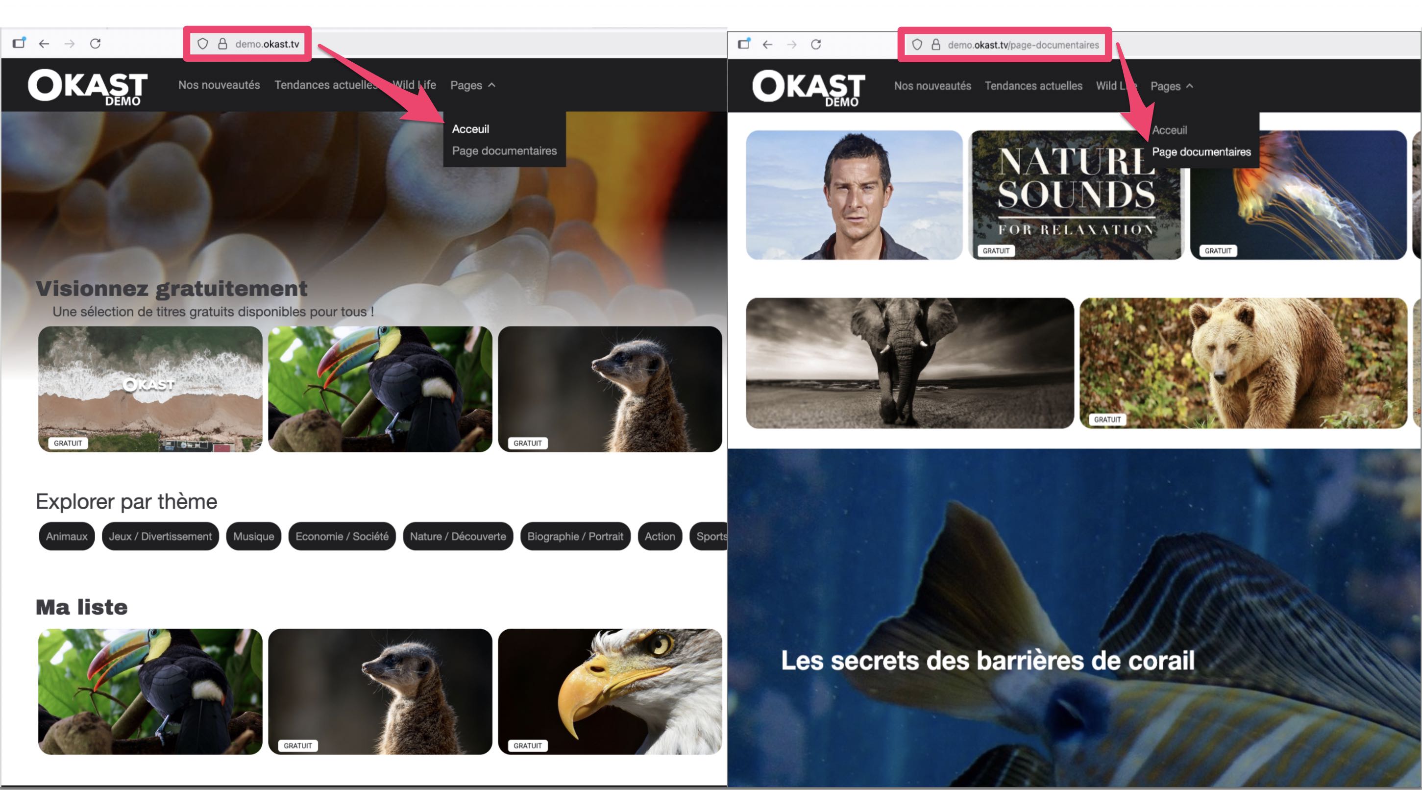 You can therefore create Theme Pages for each of your themes (documentaries, live events, cinema, etc.) with their own graphic designs, all accessible from the header of the home page.