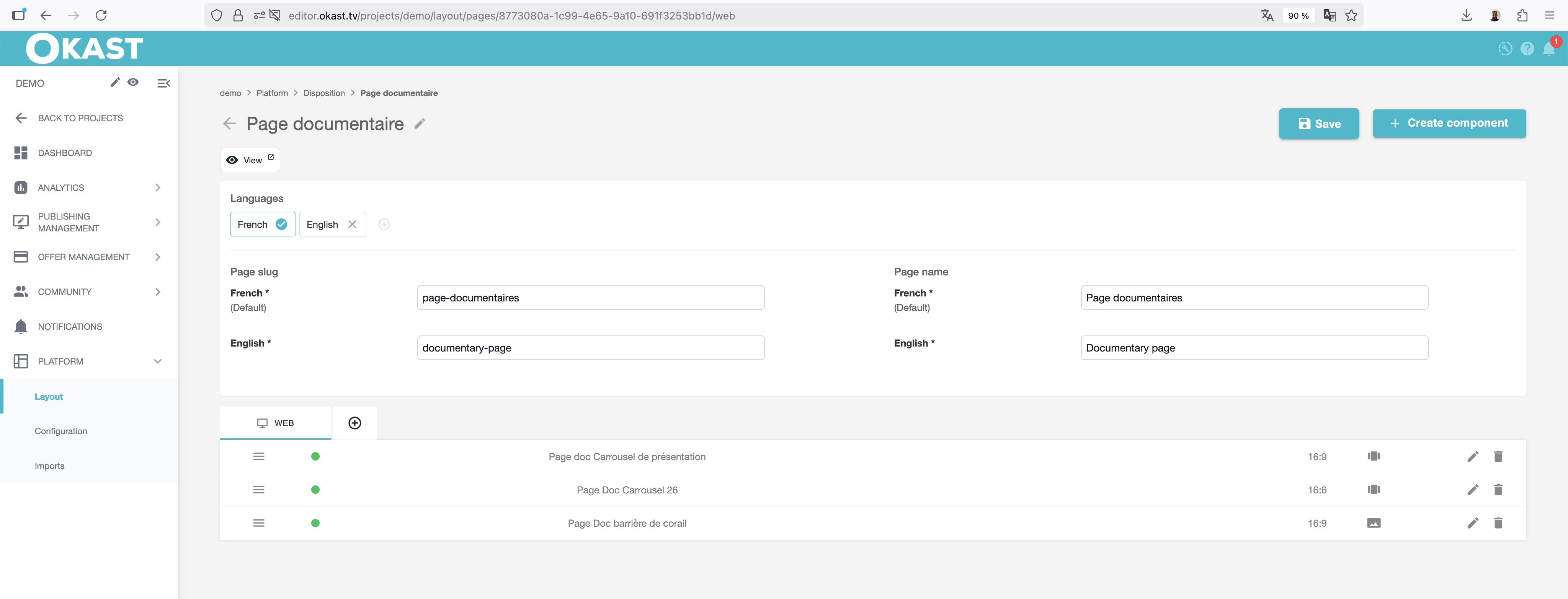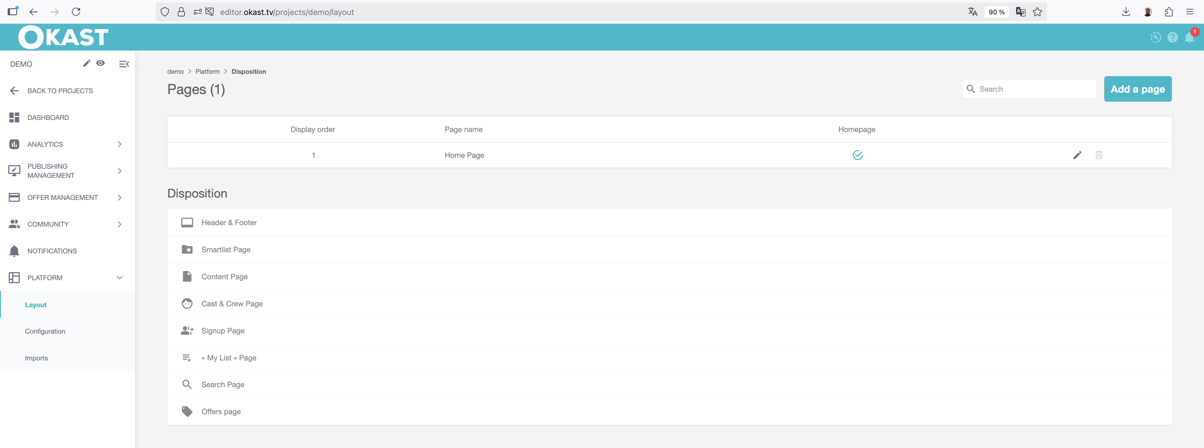 In order to improve your users' navigation and direct them to a Theme Page from the home page, we have organized the Platform > Layout menu with Theme Pages in addition to the home page: Pages.