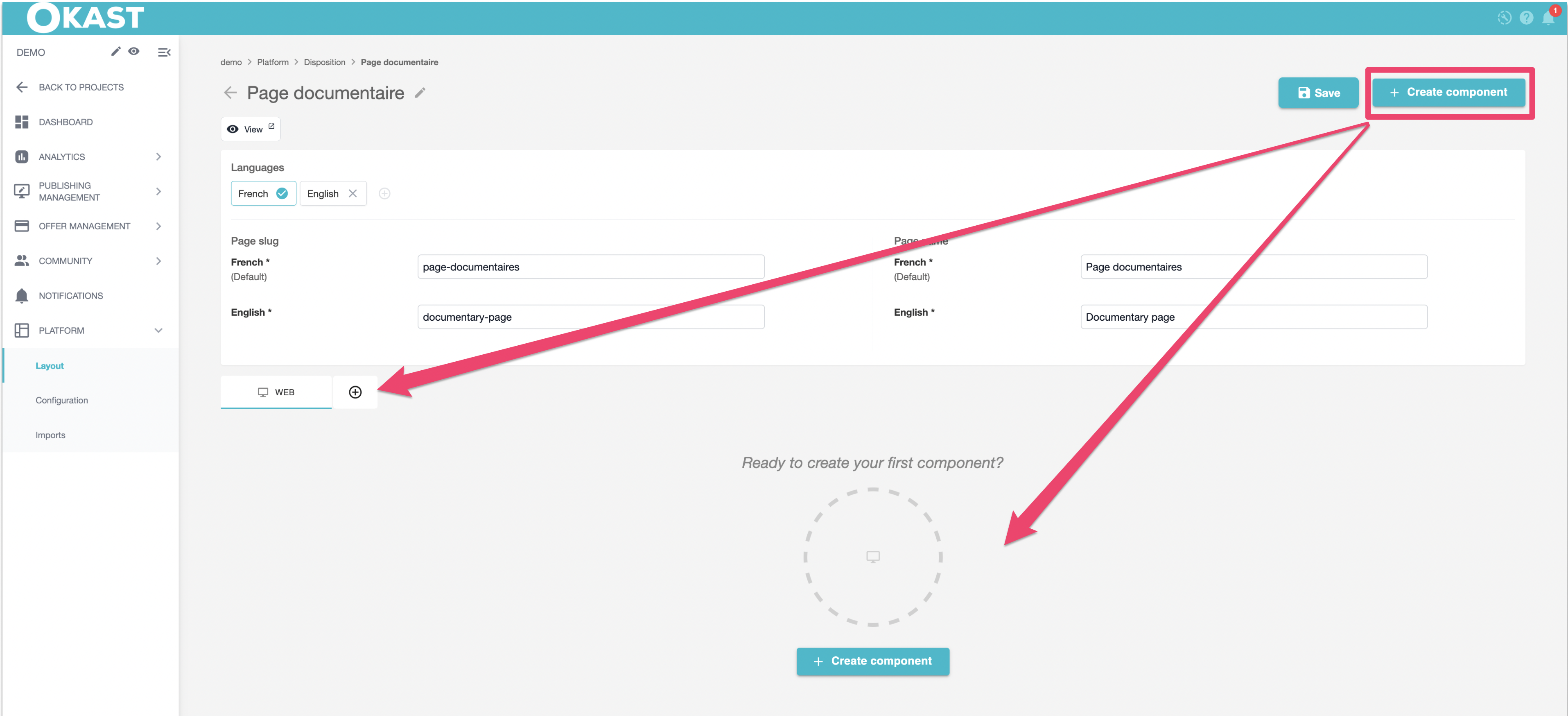 Your new page can be in French or English, but you must enter the Page Name, which will define its URL. Please note that, as always on OKAST, there cannot be two pages with the same URL.