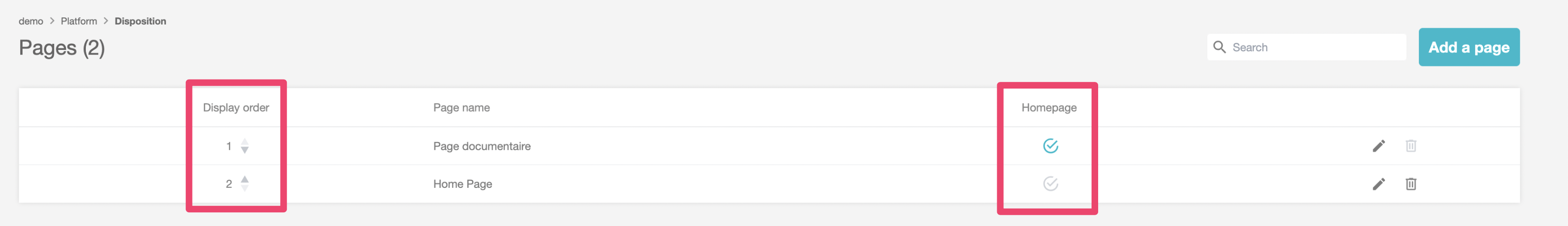 Once created and published, you can assign it the role of Homepage using the iconor change its Display order in the header using the menu