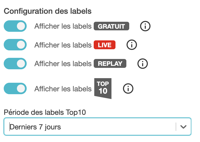 Vous pouvez activer l’affichage des labels sur les contenus gratuits, live, replay et top 10.