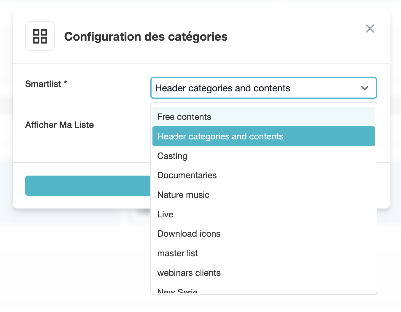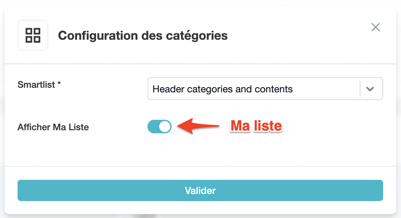 Vous pouvez afficher également la Smartlist personnalisées comme Ma Liste, pour permettre à vos utilisateurs d’avoir un raccourci vers leur liste de contenus favoris. Pour plus d’informations sur la Smartlist personnalisées Ma Liste, C'est par ici.