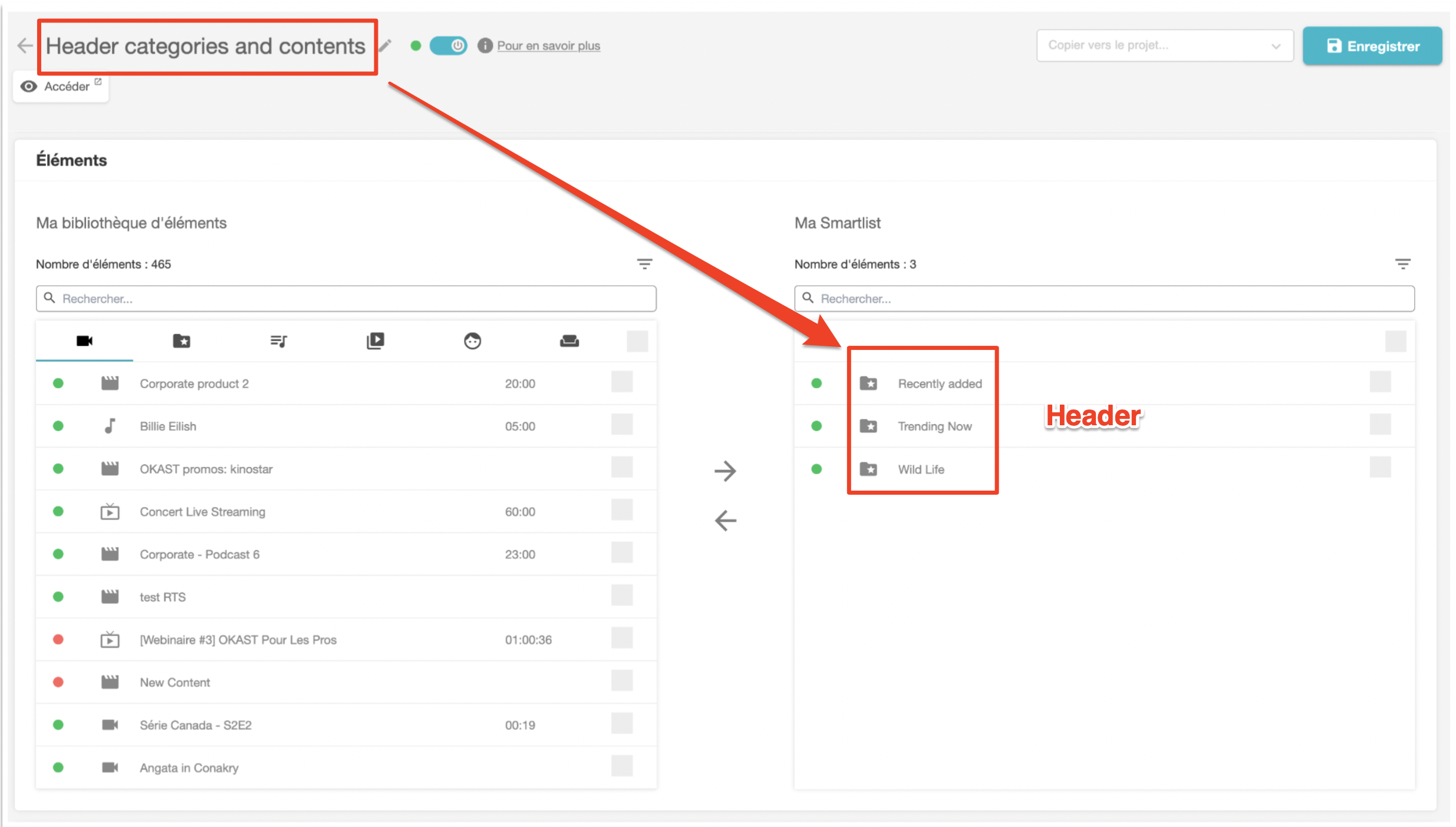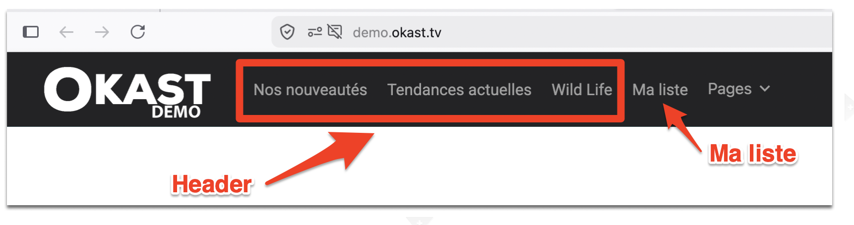 Vous pouvez ajouter des onglets raccourcis/rubriques vers des contenus ou des playlists dans le header de votre plateforme :