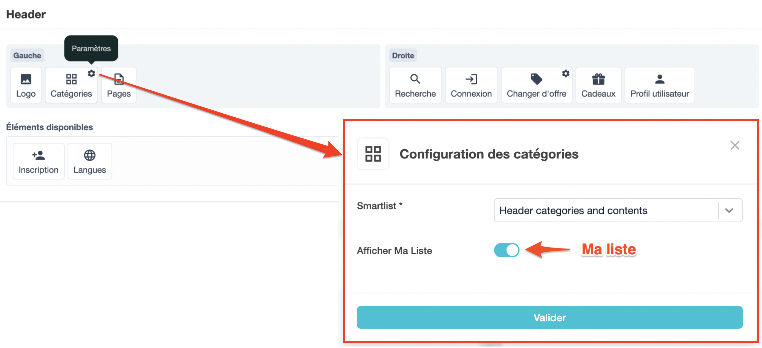 Puis, dans la section Header modifier les paramètres du menu Catégories avec la roue crantée et activer l'option Ma liste.