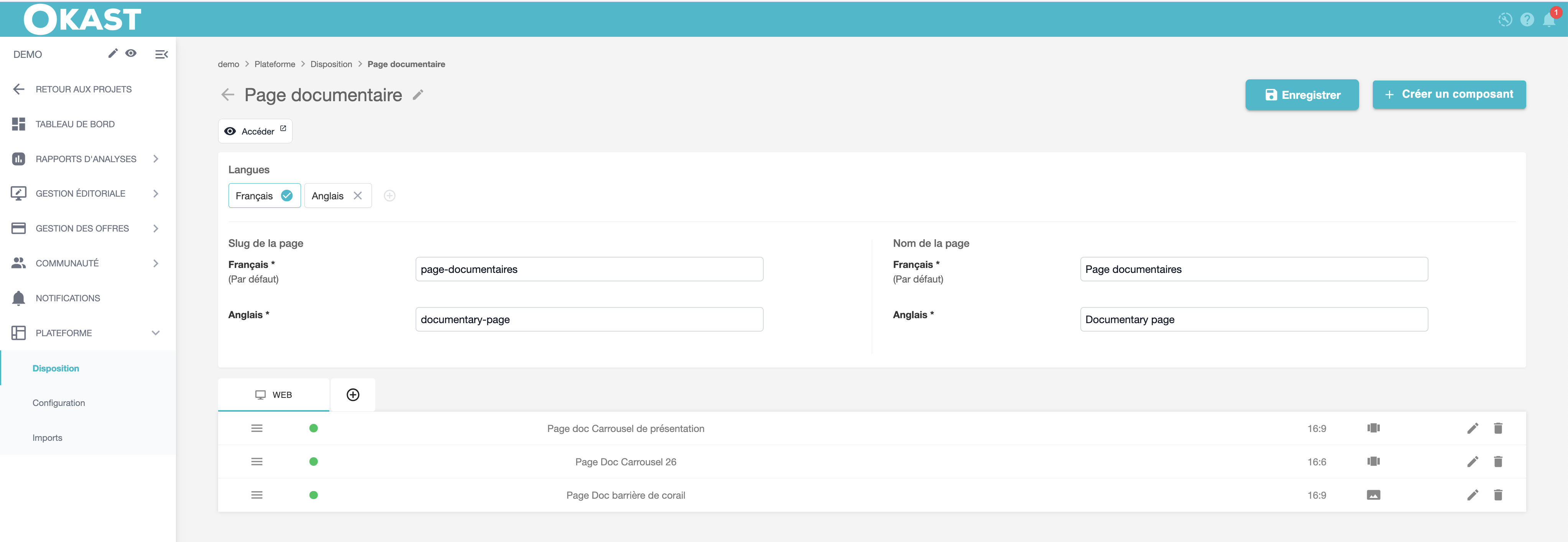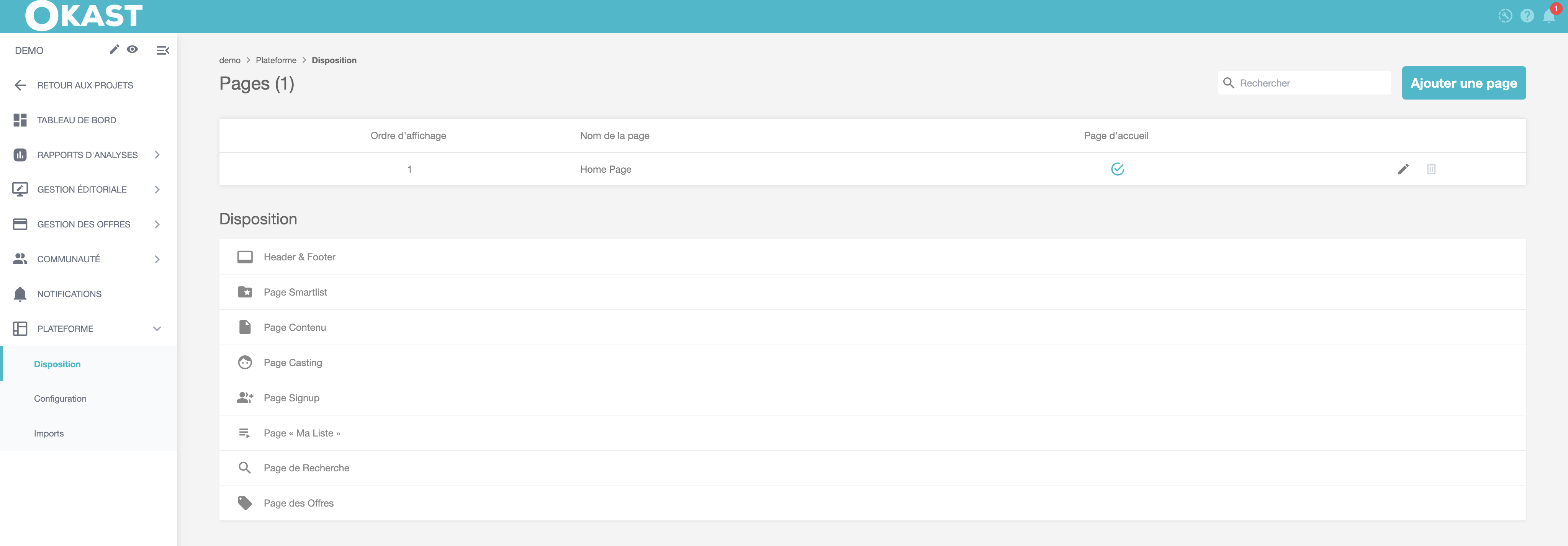 Pour créer un page thématique, rendez-vous dans le menu Plateforme > Disposition > Ajouter une page (bouton en haut à droite).