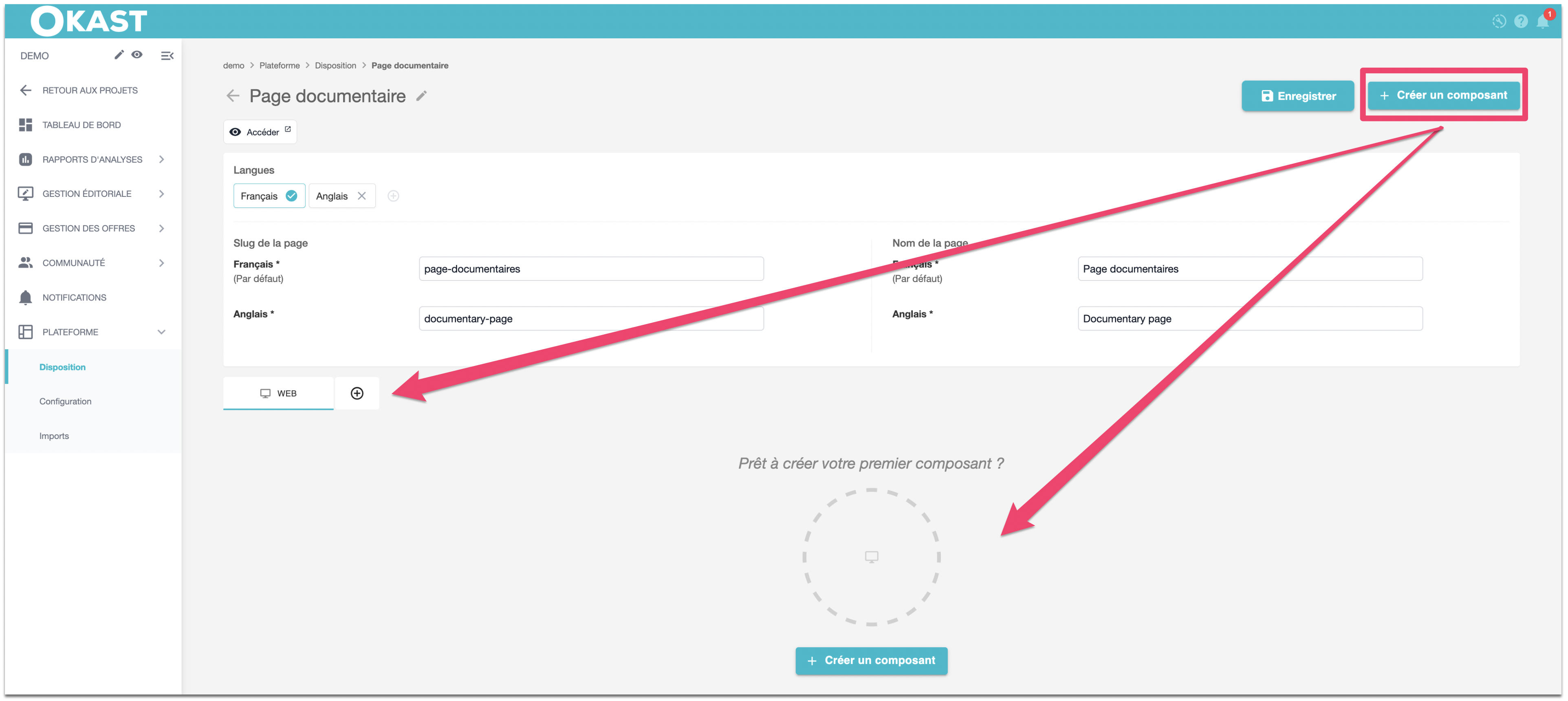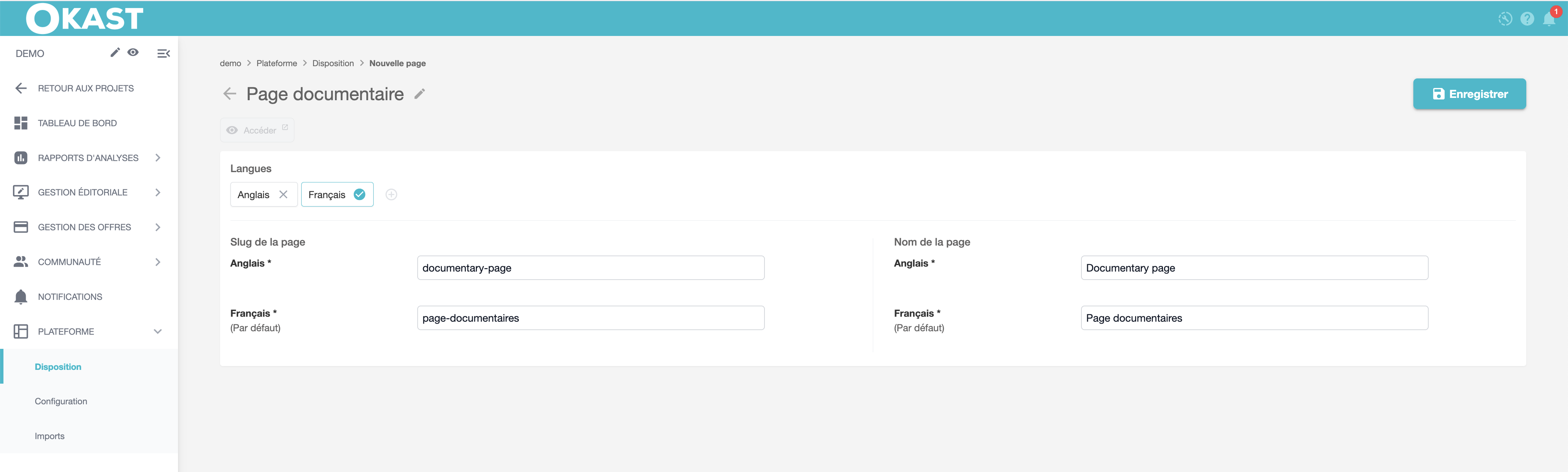 Votre nouvelle page peut se décliner en Français ou en Anglais, mais vous devez renseigner impérativement le Nom de la page qui définira son URL. Attention comme toujours sur OKAST il ne peut pas y avoir deux pages avec la même URL.