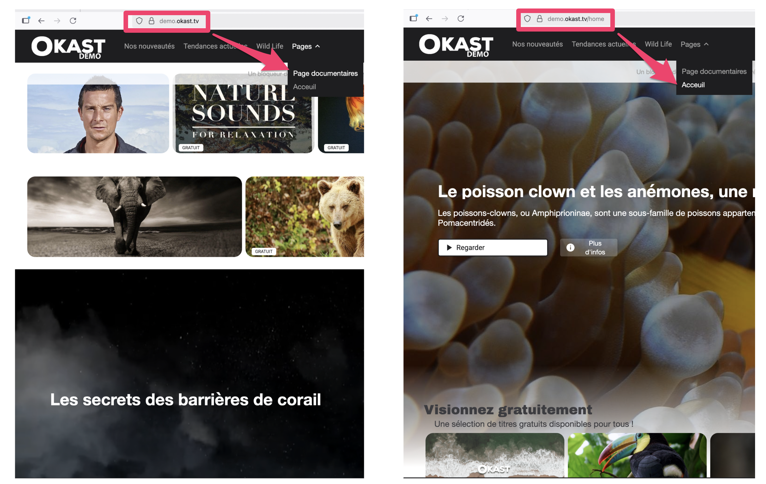 Vous pourrez donc créer des Pages thématiques pour chacun de vos thèmes (documentaire, lives, cinéma, etc.) avec des chartes graphiques propres, le tout accessible depuis le header de la page d'accueil.