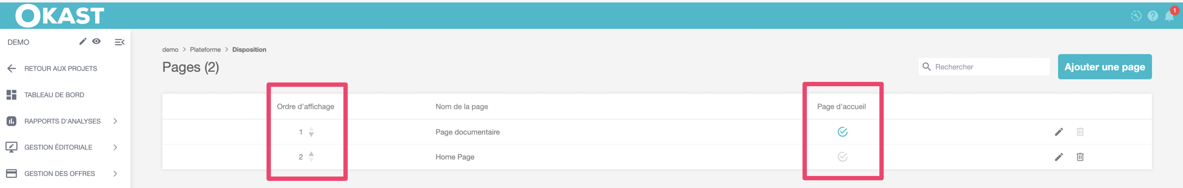 Afin d’améliorer la navigation de vos utilisateurs et de les orienter vers une Page thématique depuis le page d'accueil, nous avons reorganisé le menu Plateforme > Disposition avec des Pages thématiques en plus de la page d’accueil : Les Pages.